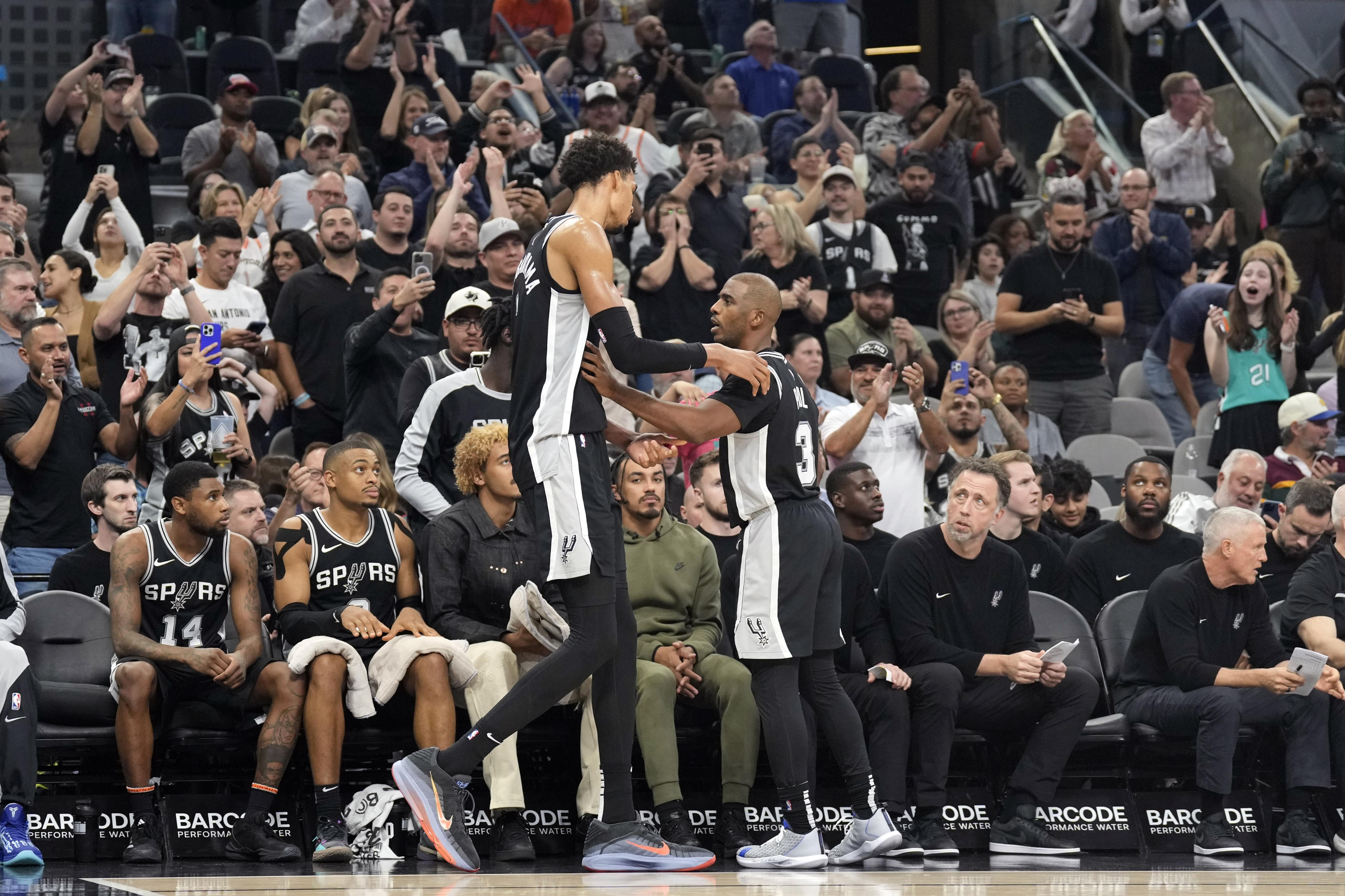 此役,保罗出战32分钟,投篮4中4,三分球3中3,罚球1中1,拿到12分7篮板8助攻4抢断1盖帽;文班出战37分13秒,24投13中,三分15中7,罚球12中9,爆砍42分6篮板5助攻2抢断4盖帽。